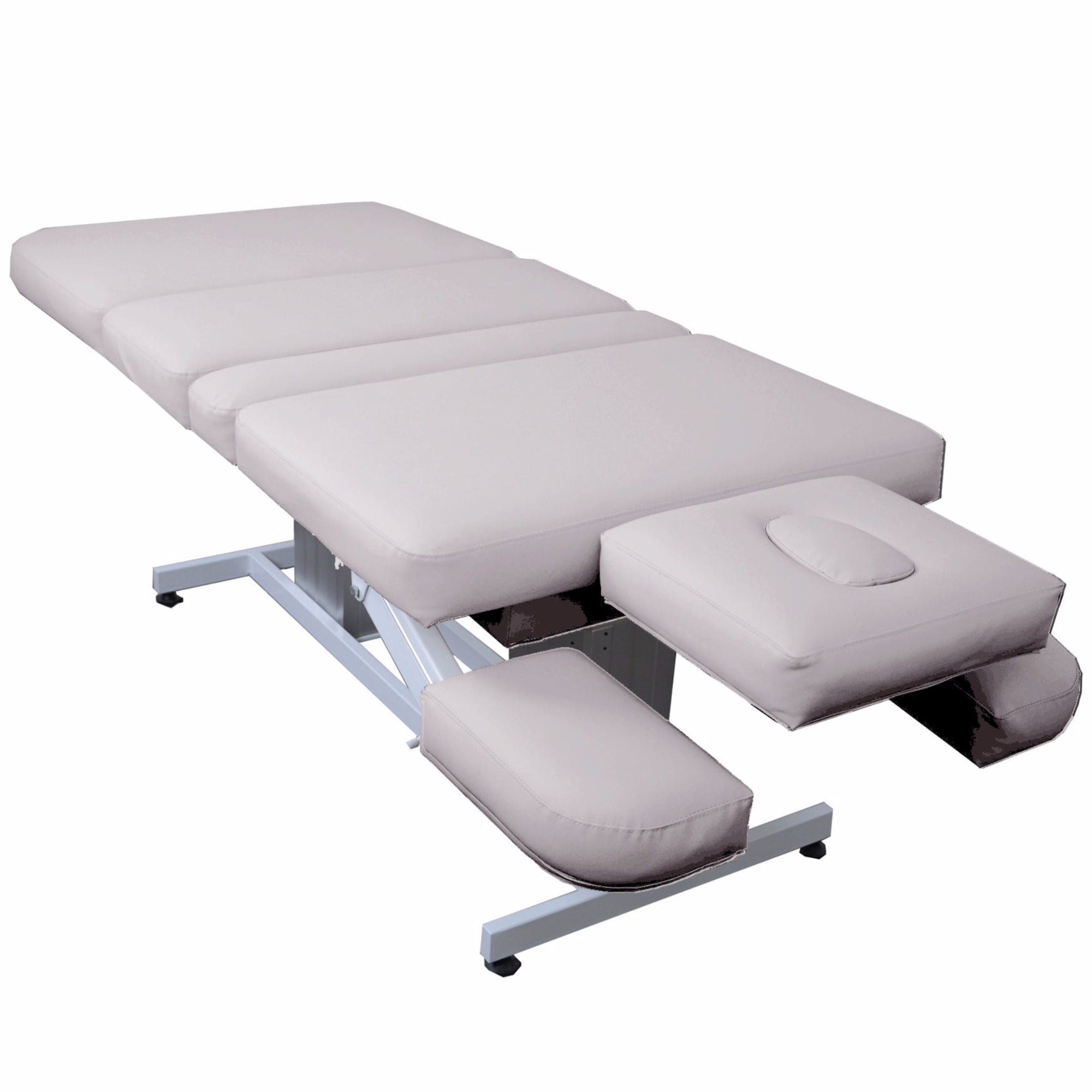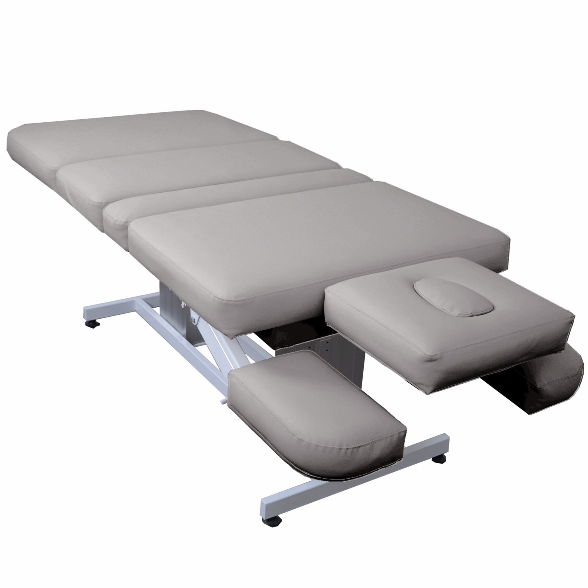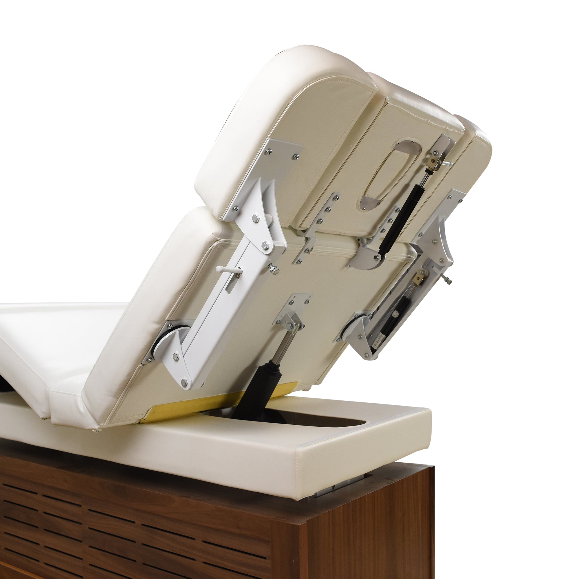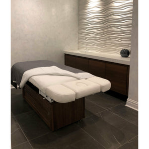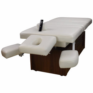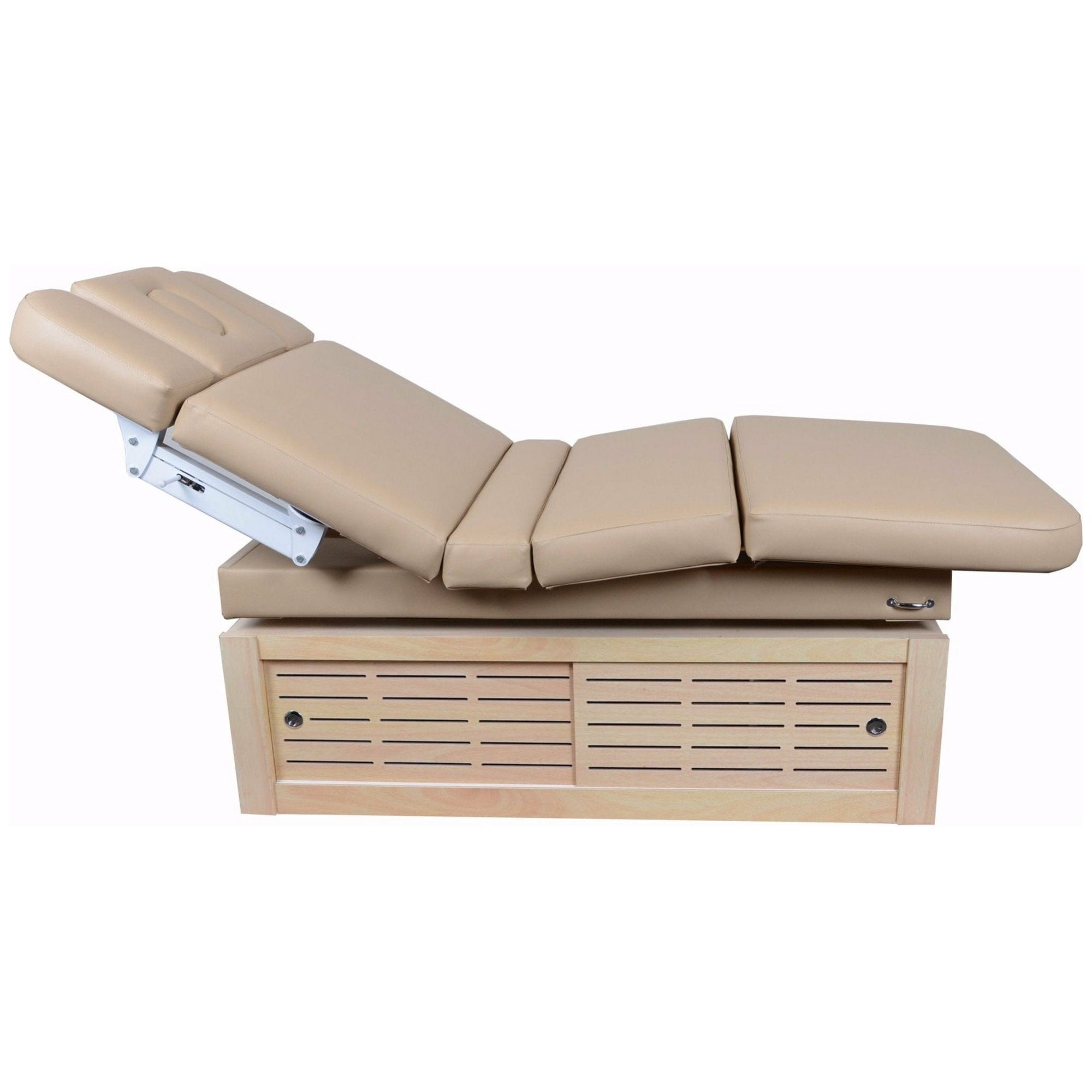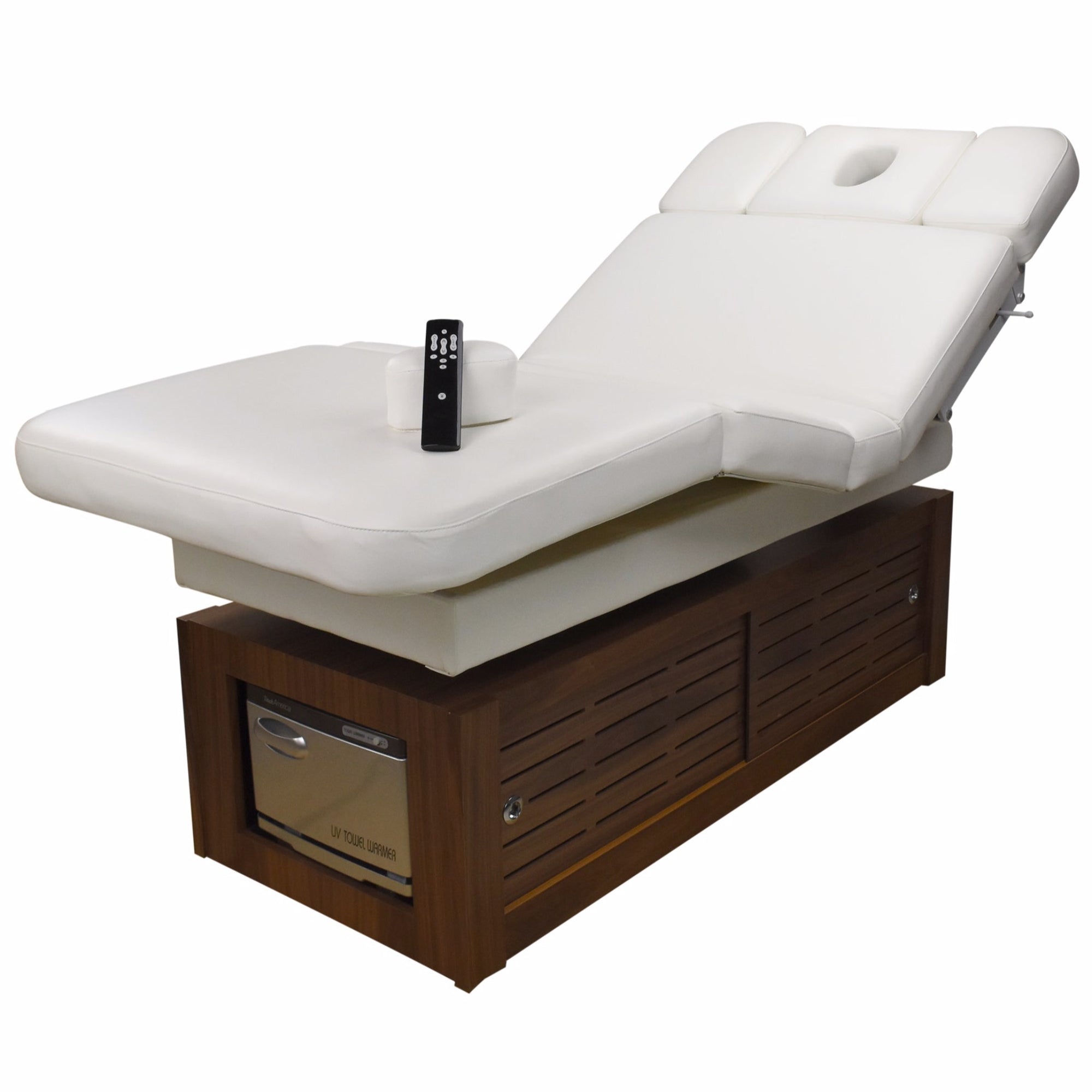 Large 33.5” x 81” super-comfortable top accommodates everyone. Dual-pedestal lift motors allow top to tilt in either direction when the cabinet isn't added. A hand control operates the back, leg, and 26” - 34” height adjustments. Optional slotted cabinet has a wenge finish. Optional Small Hot Towel Cabi can be added at the foot section of the cabinet.